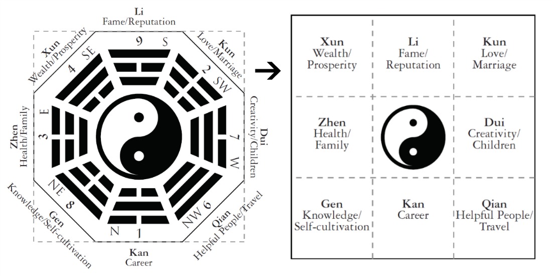 Three stacked yin-or-yang conditions make one of 8 figures, each representing something.