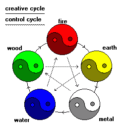 Five elements, each with a yin and yang aspect, have a creation cycle and a control cycle.